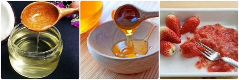 Nguyên liệu: Dầu dừa (5ml) +mật ong (5ml) + 1 quả dâu tây chín